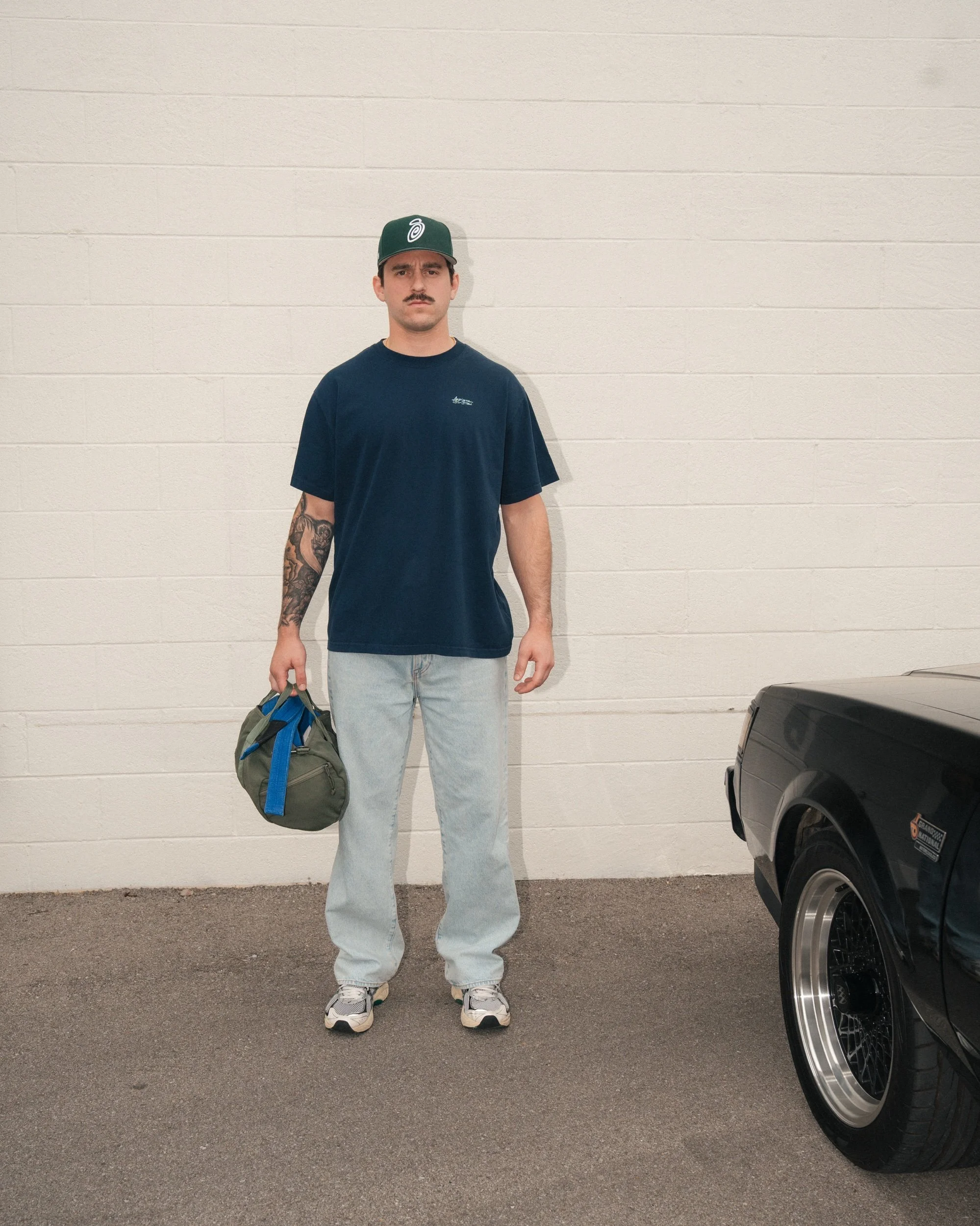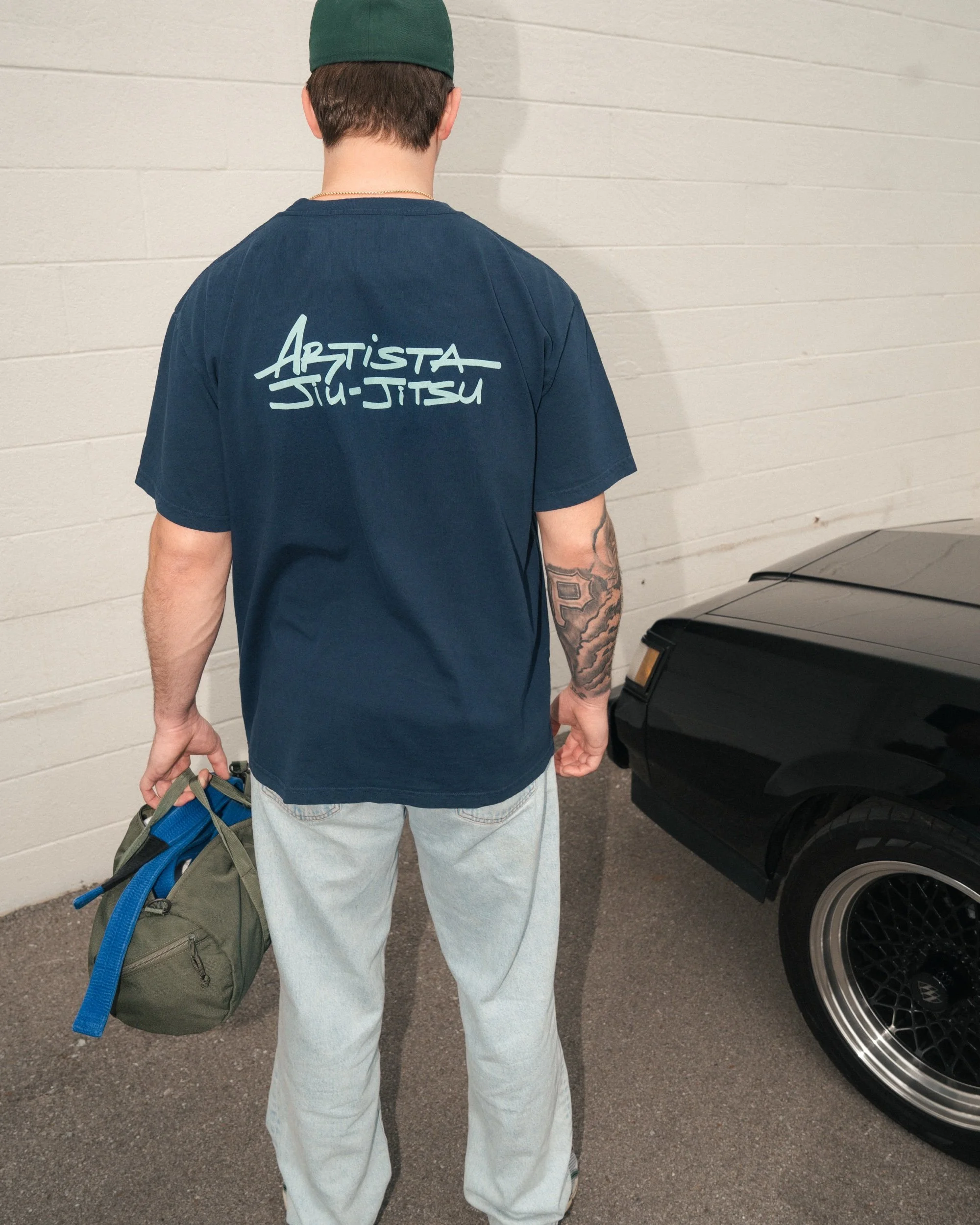 Artista Jiu-Jitsu navy shirt with light blue artwork. Small print on left chest and big print on back. Heavy weight 100% Cotton T, made in southern California.