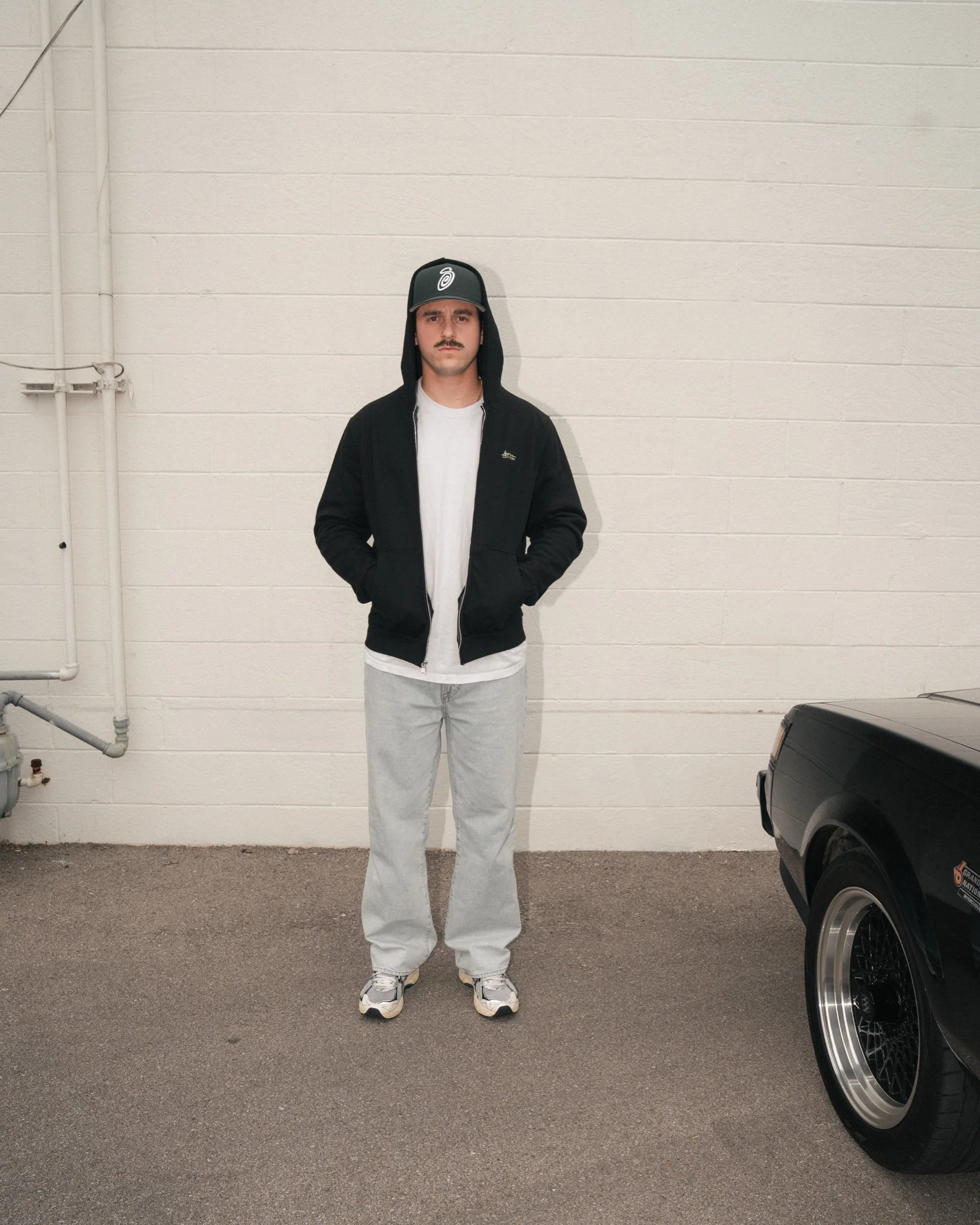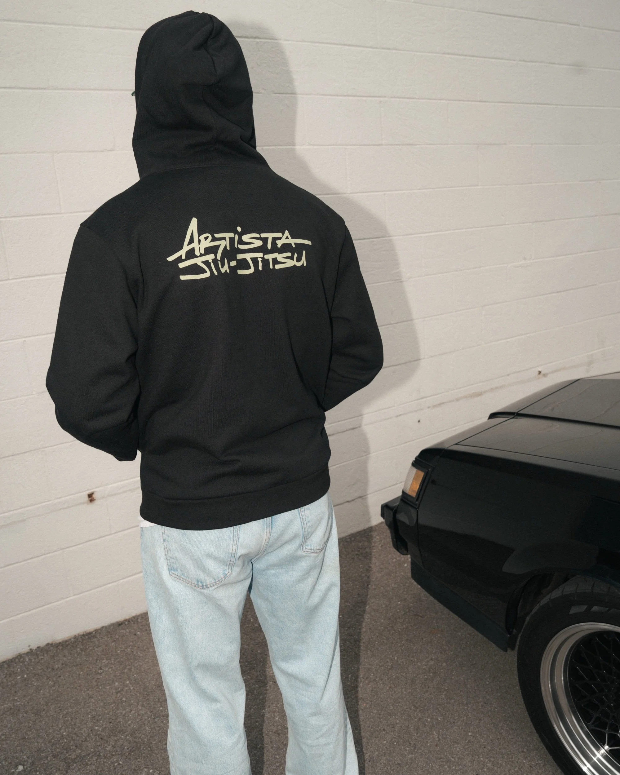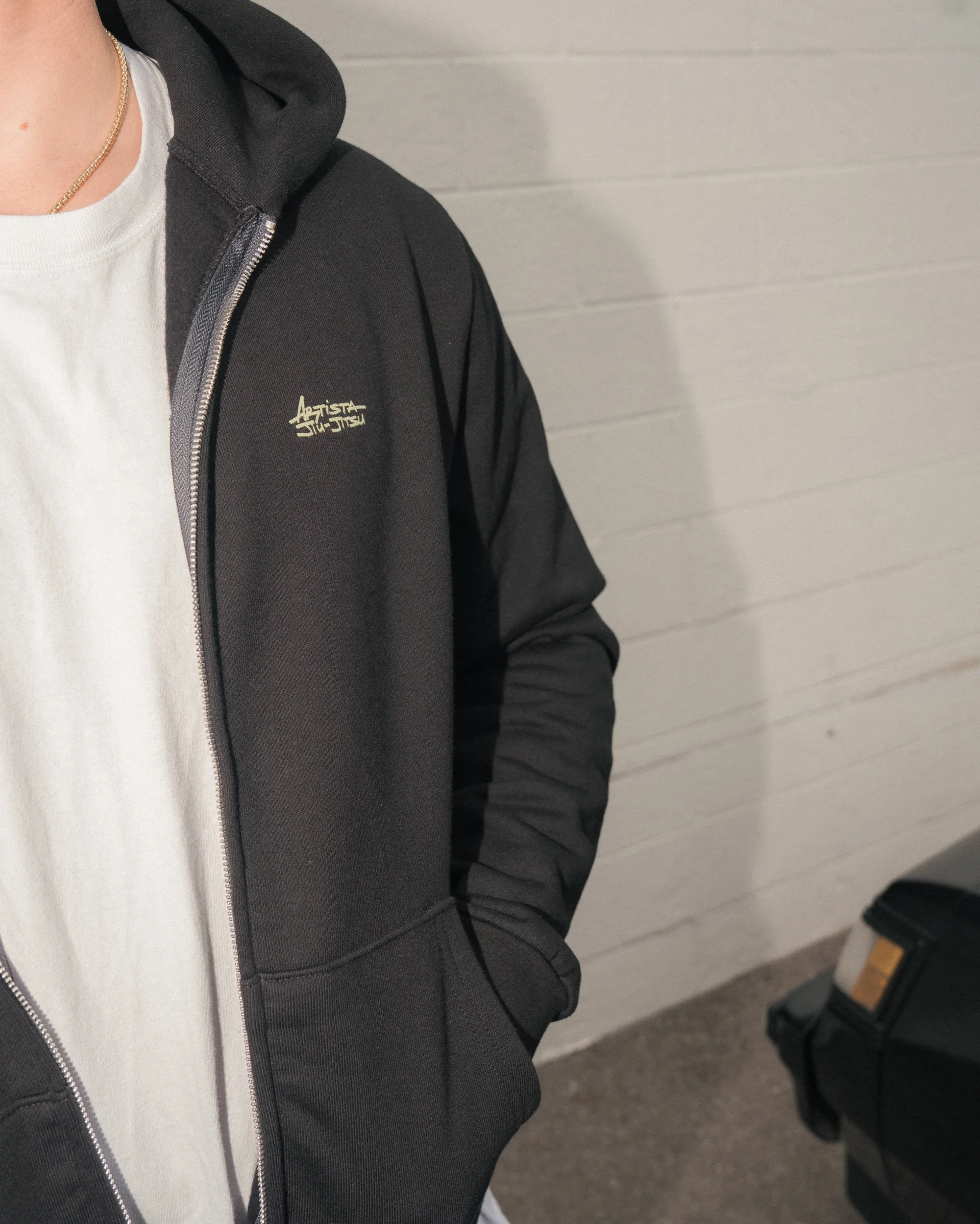 Artista black zipup hoodie featuring sage green artwork. Small print on left chest and big on back. 100% cotton, made in Southern California.